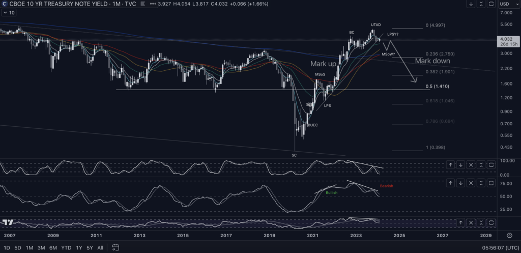 This is the monthly chart for 10-Year Treasury Yields. After the massive COVID dip, there is an equally massive uptrend (markup) period coinciding with the Federal Reserve’s pivot from “inflation is transitory” to “inflation is here to stay” in November 2021. This reflects the fear of rising interest rates, resulting in a violent upswing in yields and tremendous pressure on the stock market.