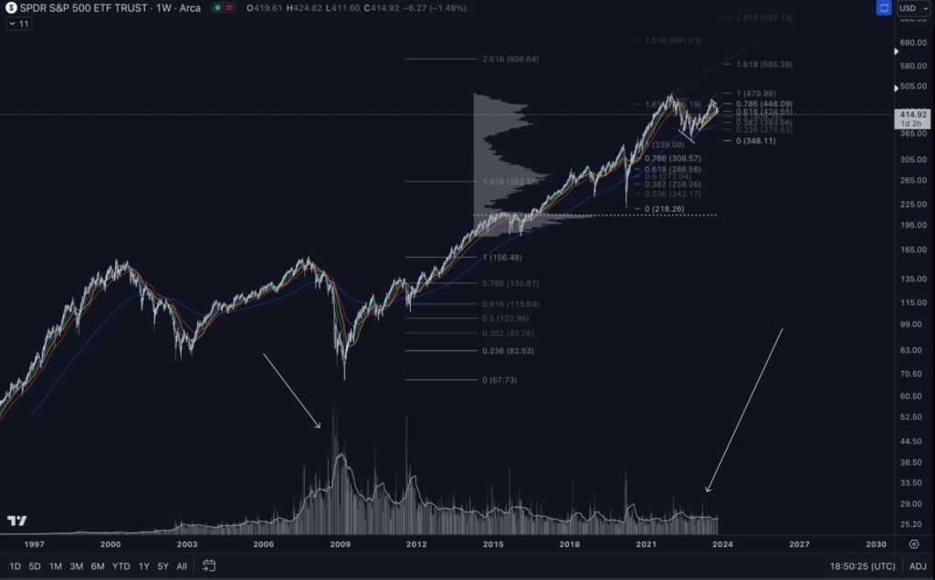 Now look at the bottom right. Notice the absence of massive volume spikes. If anything, it looks pretty average after the uptick in October 2022 when the market hit its low. That uptick was financial institutions buying the bottom while retail investors were pulling out of the market in anticipation of the expected upcoming recession.